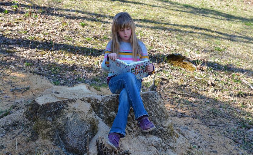 Keywords: human child girl blond long hair nature book read nature book interest natural history