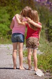 Keywords: human personal children girl blond barefoot out nature hug friends friendship brothers and sisters