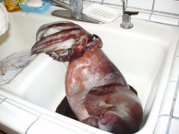 Keywords: Humboldt squid in sink.JPG Dosidicus gigas a Humboldt squid alt names jumbo flying squid or diablo rojo Note the dark red hue The squid is about 25 kilograms/50 pounds in weight Poulpy nettoie l'évier own original text self-made 1 Imageman Kitchen sinks Dosidicus |