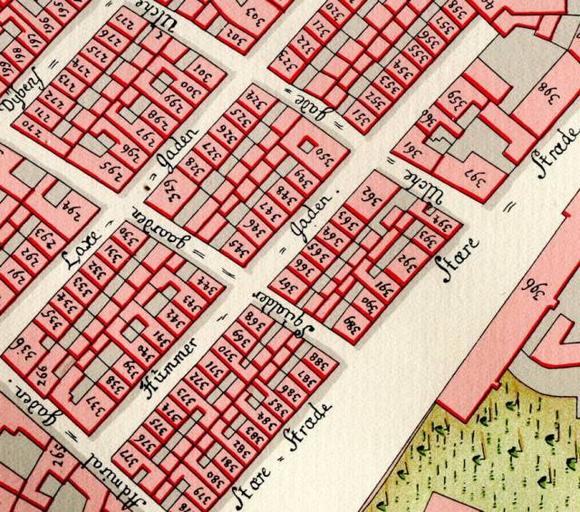| Keywords: Hummergade (Gedde).jpg en Hummergade etc seen on Gedde's district map of Østre Kvarter in Copenhagen Denmark 1757 http //www indenforvoldene dk/nedlagte 20gader 20og 20straeder html Christian Gedde other versions PD-old Bremerholm Christian Gedde |