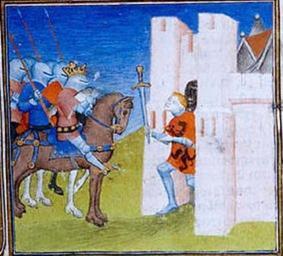 Keywords: Hunald.jpg en Grandes chroniques de France Book V Chapter 28 Hunald of Aquitaine Scene Surrender of Loches -- King possibly Pepin the Short wearing armor and holding shield rides bridled horse with group of soldiers with lances toward castle of Loches from which walks Hunald of Aquitaine wearing heraldic garment with lion rampant and holding blade of sword in right hand fr Grandes chroniques de France Livre V Chapitre 28 Hunald d'Aquitaine Scène de la reddition de Loches -- Le roi probablement Pépin le Bref revêtu d'une armure et portant un bouclier chevauche un cheval harnaché avec un groupe de soldats portant des lances autour du château de Loches duquel sort Hunald d'Aquitaine tenant la lame d'une épée dans sa main droite et habillé d'une tenue sur laquelle est dessinée un lion rampant http //corsair morganlibrary org/icaimages/5/m536 071ra jpg en Master of the Cité des Dames fr Maître de la Cité des Dames circa 1410 1412 PD-old circa 1400 1415 Grandes Chroniques de France - Morgan Library M536 |