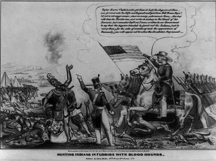 Keywords: Hunting Indians in Florida With Bloodhounds.jpg en A tableau dramatizing the brutal tactics employed by Zachary Taylor as commander of U S forces against the Seminole Indians during the Second Seminole War 1835-42 Taylor on horseback at right presides over a scene of devastation and carnage Soldiers aided by bloodhounds relentlessly pursue retreating Seminoles including a multitude of women and children who flee in panic to the left A wounded dog lies on the ground in the lower right while another lunges at the throat of a Seminole brave who shields a woman and child at left A village burns in the distance In the center an officer standing with his back to the viewer points out the slaughter to Taylor who exclaims Hurra Captain we've got them at last the dogs are at them--now forward with the Rifle and Bayonet and give them Hell Brave Boys let not a red nigger escape- show no mercy- exterminate them -this day we'll close the Florida War and write its history in the blood of the Seminole--but remember Captn as I have written to our Government to say that the dogs are intended to ferret out the Indians not to worry them for the sake of consistency and the appearance of Humanity you will appear not to notice the devastation they commit 1848 Library of Congress http //www loc gov/pictures/item/2008661482/ James Baillie other versions PD-old-70-1923 Uploaded with UploadWizard Seminole Wars |