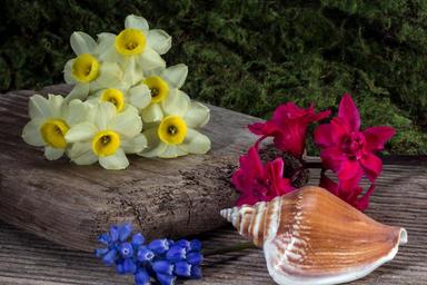 Keywords: hyacinth wood wooden board still life shell daffodils moss perlhyazinthe