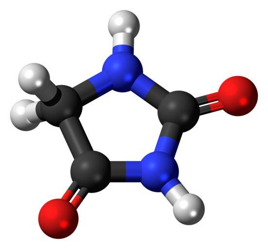 Keywords: Hydantoin-3D-balls.png Ball-and-stick model of the hydantoin molecule a nitrogen heterocycle Colour code 505050 Carbon C black<br> F0F0F0 Hydrogen H white<br> F51E1E Oxygen O red<br> 3C50FA Nitrogen N blue<br> 2011-02-03 own DS Visualizer Jynto talk Space-filling version cc-zero Hydantoin Images by Jynto Ball-and-stick models |