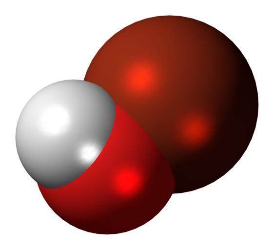 Keywords: Hypobromous acid molecule spacefill.png Space-filling model of the hypobromous acid molecule an oxoacid of bromine in an oxidation state of +1 Color code F0F0F0 Hydrogen H white<br> F51E1E Oxygen O red<br> B42814 Bromine Br red-brown<br> 2011-11-21 own DS Visualizer Jynto talk Ball-and-stick version cc-zero Images by Jynto Space-filling models Hypobromous_acid |