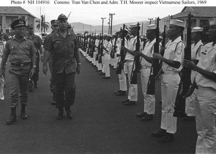 | Keywords: I04916.jpg en Commodore Tran Van Chon Chief of Naval Operations of the Republic of Vietnam Navy left and Admiral Thomas H Moorer USN U S Navy Chief of Naval Operations left center Inspect some of the Vietnamese Sailors who will take over river patrol operations from the U S Navy circa September 1969 Note the M1 Garand rifles held by the Sailors http //www history navy mil/photos/images/i04000/i04916 jpg Official U S Navy Photograph from the collections of the Naval Historical Center PD-USGov-Military-Navy Military of South Vietnam Sailors Thomas Hinman Moorer |