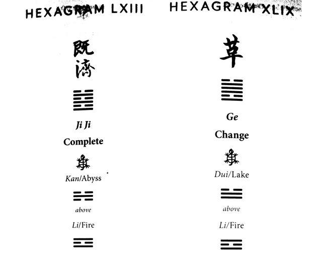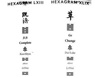Keywords: blackandwhite monochrome text black and white With "heads" = 3, and "tails" = 2, three coins were thrown six times: -- 2+2+3 = 7, Undivided Line (Young, or Unchanging, Yang) -- 3+3+2 = 8, Divided Line (Young, or Unchanging, Yin) -- 2+2+3 = 7, Undivided Line (Young, or Unchanging, Yang) -- 2+2+2 = 6, Divided Line (Old, or Changing, Yin) -- 2+2+3 = 7, Undivided Line (Young, or Unchanging, Yang) -- 3+3+2 = 8, Divided Line (Young, or Unchanging, Yin) Building up from the bottom space, this yields the trigram 7/8/7 (Li/Fire) under the trigram 6/7/8 (Kan/Abyss, transforming into Dui/Lake), and the resultant two hexagrams shown above. Chinese renderings taken from John Minford's I Ching translation. With "heads" = 3, and "tails" = 2, three coins were thrown six times: -- 2+2+3 = 7, Undivided Line (Young, or Unchanging, Yang) -- 3+3+2 = 8, Divided Line (Young, or Unchanging, Yin) -- 2+2+3 = 7, Undivided Line (Young, or Unchanging, Yang) -- 2+2+2 = 6, Divided Line (Old, or Changing, Yin) -- 2+2+3 = 7, Undivided Line (Young, or Unchanging, Yang) -- 3+3+2 = 8, Divided Line (Young, or Unchanging, Yin) Building up from the bottom space, this yields the trigram 7/8/7 (Li/Fire) under the trigram 6/7/8 (Kan/Abyss, transforming into Dui/Lake), and the resultant two hexagrams shown above. Chinese renderings taken from John Minford's I Ching translation.
