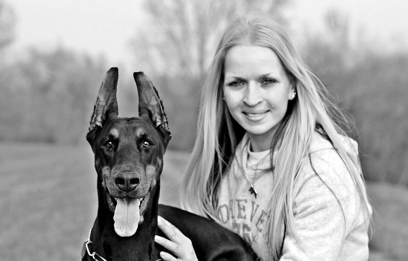 Keywords: i dog and woman black and white doberman dog animal species portrait domestic