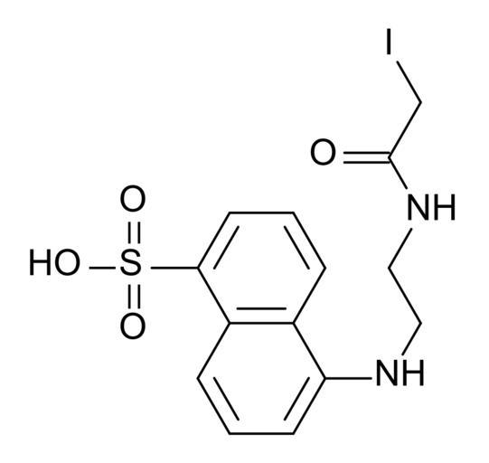 | Keywords: IAEDANS.svg validSVG Created with BKchem 001 -check IAEDANS a fluorescent dye used in molecular biology Own 2007-02-19 created by Minutemen using BKchem 0 12 PD-ineligible Naphthalene sulfonic acids Naphthylamines N-substituted primary amides Organoiodides Fluorescent dyes |