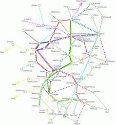 | Keywords: IC 2007.gif Lines of the German Intercity Train Network as of 2006/2007 Reconstructed using an official train time-table from that era which was then available at http //www bahn de Each coloured line on the map corresponds to one train per hour on that line Dashed lines represent one train each two hours Black lines represent extensions of the coloured lines that run only some times a day Not all systematic stops of the network are shown Especially in the Ruhr area Duisburg Bochum Essen Solingen Hagen Most of the hourly and more direct lines are InterCityExpress trains with the notable exception of the red IC Hamburg - Dortmund - Mainz The others are InterCity trains The latter are cheaper and also stop at more additional stations which are not shown on this map Drawing in Vector-Format OpenDocument Draw http //freenet-homepage de/rwp/historische_IC-Netze zip Rail transport maps of Germany InterCity Germany 2007-01-08 own assumed Robert Will |