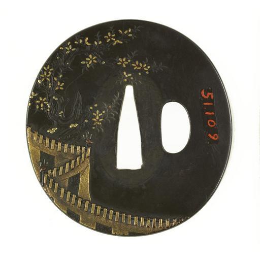 Keywords: Ichinomiya Nagatsune - Tsuba with the Elegant Gathering in a Peach Orchard - Walters 51109 - Back.jpg This tsuba shows the Chinese figures Genroku Ch Liu Bei Kanyu Ch Guan Yu and Chôhi Ch Zhang Fei in the peach orchard where they took an oath of brotherhood The episode takes place in the 14th-century novel Romance of the Three Kingdoms which tells a fictionalized account of events in the 2nd century during the Three Kingdoms period All three men led soldiers in victorious battle and Genroku became emperor of China The back depicts cloths hung to create an enclosure for a picnic in the orchard between 1732 1787 Edo shibuichi with gold and copper details cm 7 28 7 08 0 42 accession number 51 109 27108 Henry Walters Baltimore date and mode of acquisition unknown Walters Art Museum Henry Walters Acquired by Henry Walters Signature Nagatsune place of origin Kyoto Japan Walters Art Museum license Tsuba in the Walters Art Museum Ichinomiya Nagatsune Media contributed by the Walters Art Museum needs category review Oath of the peach garden |