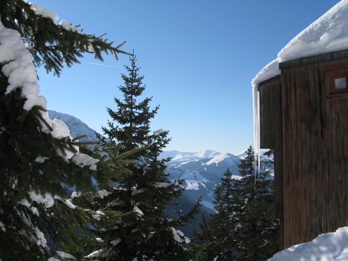 Keywords: icicle snow chalet tree pine winter mountains alps france ice cold white nature sky landscape snowfall icy wintry