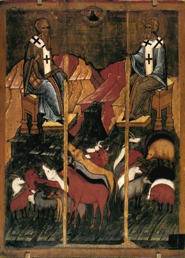 | Keywords: Icon of saint Blaise and Spiridonius.jpg  Икона «Святой Власий и святой Спи идон» http //www intellectspb ru/icon/vlas_spir html 15-17 c anonymous PD-old-100 Icons of Saint Blaise Icons of Saint Spiridion Cows in art Files uploaded by Shakko from various sources Icons of saints with two persons |