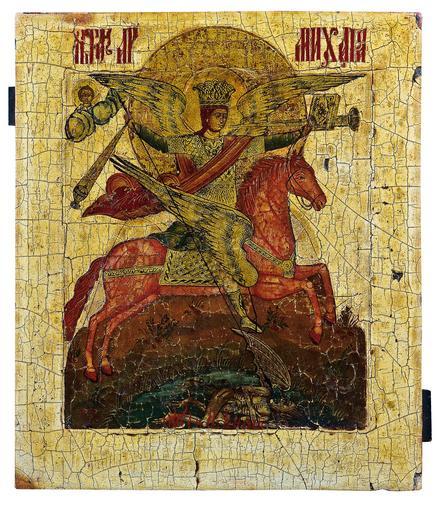 | Keywords: Icon of saint Michael horseman (Russia, 19th c., priv. coll.).jpg  St Michael Horseman of the Ap St Michael Horseman of the Apocalypse Egg tempera on wood panel with kovcheg Crowned with prominent outstretched wings astride a fiery winged horse the archangel blowing a golden trumpet raising a Book of Gospels and plunging his lance into the mouth of the Devil Christ Emmanuel appearing in swirling clouds in the left corners Rendered with saturated red and red colours complemented by gold details The background and the border stripped to gesso Russian 19th century 30 5 x 26 cm Russland 19 Jh http //www auctions-fischer de/catalogues/online-catalogues/207-i-russian-greek-icons html L 1 kategorie 93 artikel 24620 L 1 cHash 9ae84664fd century 19 anonymous Private collections of Russian art Files uploaded by Shakko from various sources PD-Art 19th-century icons of Russia Icons of Saint Michael horseman |
