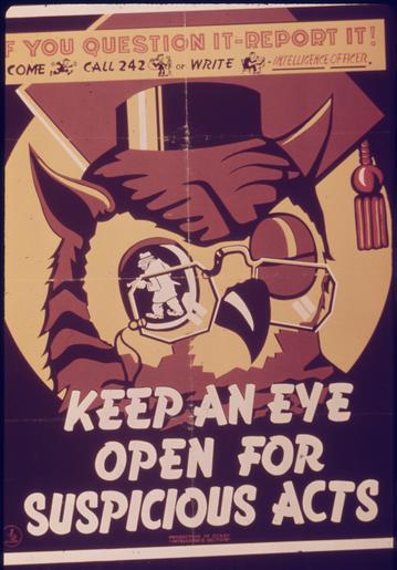 Keywords: If you question it-report it. KEEP AN EYE OPEN FOR SUSPICIOUS ACTS - NARA - 514595.tif Scope and content General notes 514595 Local identifier 44-PA-1068E Office for Emergency Management Office of War Information Domestic Operations Branch Bureau of Special Services 03/09/1943 - 09/15/1945 Still Picture Records Section Special Media Archives Services Division NWCS-S National Archives at College Park 8601 Adelphi Road College Park MD 20740-6001 1941 - 1945 Record group Record Group 44 Records of the Office of Government Reports 1932 - 1947 Record group ARC 373 World War II Posters compiled 1942 - 1945 Series ARC 513498 File unit File unit ARC Variant control numbers NAIL Control Number NWDNS-44-PA-1068E yes Other versions <gallery> File If_you_question_it-report_it _KEEP_AN_EYE_OPEN_FOR_SUSPICIOUS_ACTS_-_NARA_-_514595 tif tif File If_you_question_it-report_it _KEEP_AN_EYE_OPEN_FOR_SUSPICIOUS_ACTS_-_NARA_-_514595 jpg jpg </gallery> NARA-cooperation PD-USGov World War II posters from the United States NARA TIF images with categorized JPGs |