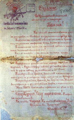 Keywords: Ilinden-Preobrazhenie-proclamation.jpg П окламация на Вто и Битолски еволюционен ок ъг на В ОРО за начало на Илинденско-П еоб аженското въстание П авописът е запазен като в о игинала Ок Unicode ѫ жно До Цент овит селскит началници и на ода Б атя айс тн многоочаквания день за асп ава съ в ковния ни душманинъ дойде вече Къ въта на нашит невинно загинали б атя отъ ту ската ти ания вика високо за отплата Погазената честь на нашит майки и сест и иска възтановяванието си Стига толкова м ѫ ки стига толкова позо ъ Хилядо п ѫ ти по-доб смъ ть отъ колкото този скотски животъ Оп д ления день въ който на ода изъ ц ла акедония и Од инско ще т бва да изл зе явно съ о ъжие в ѫ ка с щу душманина е 20-и Юлий 1903 година Посл двайте б атя вашит началници въ този ден и се събе ете подъ знамето на свободата Упо ствувайте б атя въ бо бата Само въ упо ита и дългот айна бо ба е спасението ни ека БОГЪ благослови п авото ни д ло и деня на въстанието ДОЛУ ТУРЦИЯ ДОЛУ ТИРА ИЯТА Смъ ть на душманит Да жив е АРОДА да жив е СВОБОДАТА У а Ц луваме ви б адски Щабътъ Proclamation of the Ilinden-Preobrazhenie uprising in The II Revolutionary district scanned 20 July 1903 2 August Document of Internal Macedonian-Adrianopopitan Revolutionary Organization PD-old IMARO 1903 documents 20 July Cyrillic writing Handwriting |