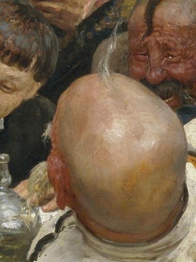 Keywords: Ilja Jefimowitsch Repin - Zaporozhian Cossacks (image detail) 8.jpg Artwork title Saporoschzen schreiben dem türkischen Sultan einen Brief Bilddetail Les Cosaques zaporogues écrivant une lettre au sultan de Turquie detail The Zaporozhye Cossacks Replying to the Sultan image detail oil canvas cm 217 361 institution Russian Museum Yorck derivative work Hic et nunc 1878-1891 Creator Ilja Jefimowitsch Repin http //mail wikipedia org/pipermail/wikide-l/2005-April/012195 html Other versions <gallery>Ilja Jefimowitsch Repin 009 jpg Original</gallery> <gallery> Ilja Jefimowitsch Repin - Zaporozhian Cossacks image detail 1 jpg image detail Ilja Jefimowitsch Repin - Zaporozhian Cossacks image detail 2 jpg image detail Ilja Jefimowitsch Repin - Zaporozhian Cossacks image detail 3 jpg image detail Ilja Jefimowitsch Repin - Zaporozhian Cossacks image detail 4 jpg image detail Ilja Jefimowitsch Repin - Zaporozhian Cossacks image detail 5 jpg image detail Ilja Jefimowitsch Repin - Zaporozhian Cossacks image detail 6 jpg image detail Ilja Jefimowitsch Repin - Zaporozhian Cossacks image detail 7 jpg image detail Ilja Jefimowitsch Repin - Zaporozhian Cossacks image detail 9 jpg image detail </gallery> cropped Hic et nunc Ilja Jefimowitsch Repin 009 jpg PD-old-70 PD-Art-YorckProject Details of Reply of the Zaporozhian Cossacks 1880-1891 Oseledets