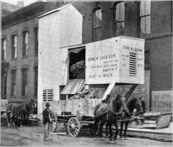Keywords: IllinoisTunnelShaft7.jpg en Original Captions Western Fig 10 Elevator House to lift the excavated clay that it may be dumped into wagons to be hauled away to the Lake Front ; Page's Fig 6 ELEVATOR HOUSE Used for lifting the excavated clay so that it may be dumped into waggons to be hauled away to the Lake Front ; Mines Fig 9 Elevator house Additional inscription on the margin of the photo as shown in Western and Mines 9-15-02 Illinois Telephone Telegraph Co Filling Wagons at Shaft No 7 This image is a composite of all three published versions in order to eliminate printing and scanning artifacts The table of construction shafts in Western page 481 shows Shaft 7 at the corner of State Street and Eldridge Court now 9th Street The http //sanborn umi com/il/1790/dateid-000018 htm CCSI 2802n 1906 Sanborn Map of Chicago sheet 83s shows the shaft on the south side of Eldridge just east of State George W Jackson Scope Extent and Construction of the Underground Conduits of the Illinois Telephone and Telegraph Co in Chicago http //books google com/books id DJ4PAQAAIAAJ pg PA489 Journal of the Western Society of Engineers Vol VII No 5 Oct 1902 ; page 489 George W Jackson Tunnel Construction in Chicago -- Method of Driving and Constructing So As Not To Disturb the Surface http //books google com/books id 5JrmAAAAMAAJ pg PA251 Mines and Minerals Vol XXIII No 6 Jan 1903 ; page 251 George W Jackson Underground Conduits in Chicago http //books google com/books id jz4AAAAAMAAJ pg PA322 Page's Magazine Vol II No 4 Apr 1903 ; page 322 George W Jackson died 1922 Date first published 1902-10 Created 1902-09-15 41 52 14 04 N 87 37 38 38 W region US_heading SSE Chicago Tunnel Company 1902 in Chicago Winding towers in the United States Elevators in the United States Horse-drawn wagons in the United States Transport of bulk freight PD-old