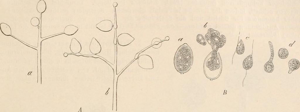 Keywords: <strong>Title</strong>: Die Natürlichen Pflanzenfamilien nebst ihren Gattungen und wichtigeren Arten, insbesondere den Nutzpflanzen, unter Mitwirkung zahlreicher hervorragender Fachgelehrten begründet <strong>Identifier</strong>: dienatrlichenp0101engl <strong>Year</strong>: <a href="https://www.flickr.com/search/?tags=bookyear1897">1897</a> (<a href="https://www.flickr.com/search/?tags=bookdecade1890">1890s</a>) <strong>Authors</strong>: <a href="https://www.flickr.com/search/?tags=bookauthorEngler_Adolf_1844_1930">Engler, Adolf, 1844-1930</a>; <a href="https://www.flickr.com/search/?tags=bookauthorPrantl_Karl_Anton_Eugen_1849_1893">Prantl, Karl Anton Eugen, 1849-1893</a>; <a href="https://www.flickr.com/search/?tags=bookauthorPilger_Robert_Knuds_Friedrich_1876_1953">Pilger, Robert Knuds Friedrich, 1876-1953</a>; <a href="https://www.flickr.com/search/?tags=bookauthorKrause_Kurt_b_1883">Krause, Kurt, b. 1883</a> <strong>Subjects</strong>: <a href="https://www.flickr.com/search/?tags=booksubjectBotany">Botany</a> <strong>Publisher</strong>: <a href="https://www.flickr.com/search/?tags=bookpublisherLeipzig_W_Engelmann">Leipzig, W. Engelmann</a> <strong>Contributing Library</strong>: <a href="https://www.flickr.com/search/?tags=bookcontributorMBLWHOI_Library">MBLWHOI Library</a> <strong>Digitizing Sponsor</strong>: <a href="https://www.flickr.com/search/?tags=booksponsorMBLWHOI_Library">MBLWHOI Library</a> <strong>View Book Page</strong>: <a href="https://archive.org/stream/dienatrlichenp0101engl/#page/n126/mode/1up" rel="nofollow">Book Viewer</a> <strong>About This Book</strong>: <a href="https://archive.org/details/dienatrlichenp0101engl" rel="nofollow">Catalog Entry</a> <strong>View All Images</strong>: <a href="https://www.flickr.com/search/?tags=bookiddienatrlichenp0101engl">All Images From Book</a> Click here to <a href="https://archive.org/stream/dienatrlichenp0101engl/#page/n126/mode/1up" rel="nofollow"><strong>view book online</strong></a> to see this illustration in context in a browseable online version of this book. <strong>Text Appearing Before Image: </strong> <em>Peronosporineae. (Schröter.) 113 B. Conidien mit einem Keimschlauche Iceimend. a. Conidien am oberen Ende mit einer Papille, durch welche der Keimschlauch austritt 5. Bremia. b. Conidien ohne Papille, an der Seite auskeimend 6. Peronospora. I. Phytophthora De Bary. Mycel inter-und intracellular; Hauslorien fehlend oder sparsam, fadenförmig. Conidienträger bis zur Bildung der ersten Conidie einfach, hierauf weiterwachsend und sparsam verzweigt. Conidien anfangs end-, später seitenständig, eiförmig, an der Spitze mit einer Papille, Schwärmsporen bildend, welche durch die geÖCfnele Papille austreten, ausnahmsweise mit einem Keimschlauche keimend. Oosporen kugelig, mit dünnem, gelblichem Epispor, mit einem Keimschlauch keimend.</em> <strong>Text Appearing After Image: </strong> <em>Fig. 97. Phytophthora infestans (Montagnej i»e Bary. A Conidieuträger mit Conidien, a erste Conidieu an den Zweigspitzen, h si)ü,terer Zustand mit seitlicher Verschiebung der älteren Conidien; D Sehwärmsporen, a noch in der Couidie lagernd, nach Teilung des Inhalts, h Entleerung der Schwärmsporen, c ausgetretene Schwärmsporen, d Keimung. (4 etwa 200/1, B 390/1.) (Nach De Bary.) 3 Arten. Ph. infestans (Montagne) De Bary Fig. 97), Conidienträger zart, einzeln oder in kleinen Büscheln aus den Spaltöffnungen vortretend, sparsam verzweigt; Äste aufrecht abstehend, unterhalb der Stelle, an der sich eine Conidie gebildet, blasig angeschwollen. Conidien end- und seitenständig, eiförmig, am Scheitel mit einer flachen Papille, 27—30 |a lang, 4 5—20 [j. breit; Membran farblos, glatt; Inhalt farblos. Schwärmsporen zu 6—16 (meist etwa 10) in einer Conidie gebildet. Oosporen unbekannt. Bildet auf den B. der Nährpfl. zarte weiße Rasen, welche excentrisch weiterschreiten und schnell verschwinden, indem sie die ergriffene Blattstelle bräunen und zum Absterben bringen. Auf Solanum tuberosum und Lycopersicum officinale in Europa und Nordamerika verbreitet; auch an einigen anderen Solanaceen (z. B. S. utile, S. viscosum, S. Dulcamara und der neuhollän- dischen Anthocercis viscosa), sowie an der aus Chile stammenden Scrophidariacee Schizanthus Grahami gefunden. Der Pilz verursacht auf Solanum tuberosum die weit- verbreitete »Kartoffelkrankheit« (Trockenfäule), welche sowohl auf den Feldern das Kar- toffelkraut (B., Stengel, junge Fr.) ergreift und durch die schnelle Vernichtung desselben die Entwickelung der Kartoffeln hindert, als auch auf diese selbst übergeht und eine durch Bräunung des Gewebes sich verratende fortschreitende Fäulnis hervorruft, die in den Kellern sich weiter überträgt und dadurch große Vorräte zum Genüsse unbrauchbar machen kann. Die Krankheit soll nach Martius etwa seit 1830 in Deutschland bekannt sein, nahm aber erst seit 1840 einen bedrohlichen Charakter an, der sich bis gegen 1850 steigerte. Seitdem tritt der Pilz zwar alljährlich, meist vom Juli an auf, doch veranlasst er nur in nassen Jahren größeren Schaden. Man glaubt, dass der Pilz von Chile, dem Vaterlande der Kartoffeln, wo Ph. infestans auf mehreren wildwachsenden Solanaceen vorkommen soll, eingeschleppt worden sei, vielleicht mit Guano. Wie er sich von einem Jahr zum andern erhält, ist noch unbekannt, da trotz alles Suchens darnach Dauersporen von ihm noch nicht gefunden worden sind. De Bary fand, dass das Mycel von kranken Kartoffeln im Frühjahr in die jungen Triebe aufsteigen und hier Conidien bilden kann, so dass auf diese Weise die Krankheit aufs neue übertragen werden kann. Die Bekämpfung der Krankheit ist meist auf indirectem Wege durch Einführung dickschaliger, widerstandsfähigerer Kartofl'elsorten oder durch besondere Culturmethoden versucht worden, neuerdings hat man auch die directe Bekämpfung Natürl. Pflanzenfam. I. 1. s</em> <strong>Note About Images</strong> <em>Please note that these images are extra