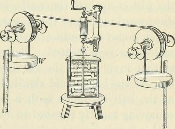 | Keywords: bookid:practicalphysics00mill bookidpracticalphysics00mill bookyear:1922 bookyear1922 bookdecade:1920 bookdecade1920 bookcentury:1900 bookcentury1900 bookauthor:millikan__robert_andrews bookauthormillikanrobertandrews bookauthor:gale__henry_gordon bookauthorgalehenrygordon booksubject:physics booksubjectphysics bookpublisher:boston___ginn_and_co_ bookpublisherbostonginnandco bookcontributor:university_of_british_columbia_library bookcontributoruniversityofbritishcolumbialibrary booksponsor:university_of_british_columbia_library booksponsoruniversityofbritishcolumbialibrary bookleafnumber:182 bookleafnumber182 bookcollection:ubclibrary bookcollectionubclibrary bookcollection:toronto bookcollectiontoronto sketch drawing text illustration cartoon writing monochrome bookid:practicalphysics00mill bookidpracticalphysics00mill bookyear:1922 bookyear1922 bookdecade:1920 bookdecade1920 bookcentury:1900 bookcentury1900 bookauthor:millikan__robert_andrews bookauthormillikanrobertandrews bookauthor:gale__henry_gordon bookauthorgalehenrygordon booksubject:physics booksubjectphysics bookpublisher:boston___ginn_and_co_ bookpublisherbostonginnandco bookcontributor:university_of_british_columbia_library bookcontributoruniversityofbritishcolumbialibrary booksponsor:university_of_british_columbia_library booksponsoruniversityofbritishcolumbialibrary bookleafnumber:182 bookleafnumber182 bookcollection:ubclibrary bookcollectionubclibrary bookcollection:toronto bookcollectiontoronto sketch drawing text illustration cartoon writing monochrome Identifier: practicalphysics00mill Title: Practical physics Year: 1922 (1920s) Authors: Millikan, Robert Andrews Gale, Henry Gordon Subjects: Physics Publisher: Boston : Ginn and Co. Contributing Library: University of British Columbia Library Digitizing Sponsor: University of British Columbia Library View Book Page: Book Viewer About This Book: Catalog Entry View All Images: All Images From Book Click here to view book online to see this illustration in context in a browseable online version of this book. Text Appearing Before Image: weights in causing them to descendthrough any distance (/ was equalto their weight W tinies this dis-tance. If the weights descendedslowly and uniformly, this workwas all expended in overcomingthe resistance of the water tothe motion of the paddle wheelsthrough it; that is, it was wastedin eddy currents in the water.Joule measured the rise in thetemperature of the water andfound that the mean of his threebest trials gave 427 gram metersas the amount of work required to d-evelop enough heat to raise a gram of water one degree. This value,confirmed by modern experiments, is now generally accepted as correct.He then repeated the experiment, substituting mercury for water, andobtained 12.5 gram meters as the work necessary to produce a calorie ofheat. The difference between these numbers is less than was to havebeen expected from the unavoidable errors in the observations. Hethen devised an arrangement in which the heat was developed by thefriction of iron on iron, and again obtained 425. Text Appearing After Image: Fig. 108. Joules first experiment onthe mechanical eqvuvalent of heat 154 WORK AJsD HEAT ENERGY 184. Heat produced by collision. A Frenchman namedHirn was the first to make a careful cletermmation of therelation between the heat developed by collision and the kineticenergy which disappears. lie allowed a steel cylinder to fallthrough a known height and crush a lead ball by its impactupon it. The amount of heat developed in the lead was meas-ured by observing the rise in temperature of a small amount ofwater into which the lead was quickly plunged. As the meanof a large number of trials he also found that 425 gram metersof energy disappeared for each calorie of heat that appeared. 185. Heat produced by the compression of a gas. Another wayin which Joule measured the relation between heat and workwas by compressing a gas and comparing the amount of workdone in the compression with the amount of heat developed. Every bicyclist is aware of the fact tliat when he inflates histires the pump Note About Images Please note that these images are extracted from scanned page images that may have been digitally enhanced for readability - coloration and appearance of these illustrations may not perfectly resemble the original work. Identifier: practicalphysics00mill Title: Practical physics Year: 1922 (1920s) Authors: Millikan, Robert Andrews Gale, Henry Gordon Subjects: Physics Publisher: Boston : Ginn and Co. Contributing Library: University of British Columbia Library Digitizing Sponsor: University of British Columbia Library View Book Page: Book Viewer About This Book: Catalog Entry View All Images: All Images From Book Click here to view book online to see this illustration in context in a browseable online version of this book. Text Appearing Before Image: weights in causing them to descendthrough any distance (/ was equalto their weight W tinies this dis-tance. If the weights descendedslowly and uniformly, this workwas all expended in overcomingthe resistance of the water tothe motion of the paddle wheelsthrough it; that is, it was wastedin eddy currents in the water.Joule measured the rise in thetemperature of the water andfound that the mean of his threebest trials gave 427 gram metersas the amount of work required to d-evelop enough heat to raise a gram of water one degree. This value,confirmed by modern experiments, is now generally accepted as correct.He then repeated the experiment, substituting mercury for water, andobtained 12.5 gram meters as the work necessary to produce a calorie ofheat. The difference between these numbers is less than was to havebeen expected from the unavoidable errors in the observations. Hethen devised an arrangement in which the heat was developed by thefriction of iron on iron, and again obtained 425. Text Appearing After Image: Fig. 108. Joules first experiment onthe mechanical eqvuvalent of h