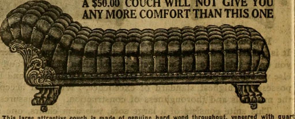 | Keywords: bookid:catalogueno16spr00macy bookidcatalogueno16spr00macy bookyear:1911 bookyear1911 bookdecade:1910 bookdecade1910 bookcentury:1900 bookcentury1900 bookauthor:macy_s__firm_ bookauthormacysfirm booksubject:department_stores__catalogs booksubjectdepartmentstorescatalogs booksubject:trade_catalogs__department_stores_ booksubjecttradecatalogsdepartmentstores bookpublisher:r_h__macy__new_york bookpublisherrhmacynewyork bookcontributor:winterthur_museum_library bookcontributorwinterthurmuseumlibrary booksponsor:lyrasis_members_and_sloan_foundation booksponsorlyrasismembersandsloanfoundation bookleafnumber:341 bookleafnumber341 bookcollection:winterthurlibrary bookcollectionwinterthurlibrary bookcollection:americana bookcollectionamericana monochrome bookid:catalogueno16spr00macy bookidcatalogueno16spr00macy bookyear:1911 bookyear1911 bookdecade:1910 bookdecade1910 bookcentury:1900 bookcentury1900 bookauthor:macy_s__firm_ bookauthormacysfirm booksubject:department_stores__catalogs booksubjectdepartmentstorescatalogs booksubject:trade_catalogs__department_stores_ booksubjecttradecatalogsdepartmentstores bookpublisher:r_h__macy__new_york bookpublisherrhmacynewyork bookcontributor:winterthur_museum_library bookcontributorwinterthurmuseumlibrary booksponsor:lyrasis_members_and_sloan_foundation booksponsorlyrasismembersandsloanfoundation bookleafnumber:341 bookleafnumber341 bookcollection:winterthurlibrary bookcollectionwinterthurlibrary bookcollection:americana bookcollectionamericana monochrome Identifier: catalogueno16spr00macy Title: Catalogue no. 16, spring/summer / R. H. Macy &amp; Co. Year: 1911 (1910s) Authors: Macy's (Firm) Subjects: Department stores--Catalogs Trade catalogs--Department stores. Publisher: R.H. Macy, New York Contributing Library: Winterthur Museum Library Digitizing Sponsor: Lyrasis Members and Sloan Foundation View Book Page: Book Viewer About This Book: Catalog Entry View All Images: All Images From Book Click here to view book online to see this illustration in context in a browseable online version of this book. Text Appearing Before Image: A $50.00 COUCH WILL NOT GIVE YOUANY MORE COMFORT THAN THIS ONE In this Qouch we are giving a great value. It is made with deep tufted top and front,ha* a solid genuine hard wood frame veneered with quarter sawed oak and flnished In theeolden oak gloss. It is well braced and Uie spring wurk is e^iarantoed. .\n sie«l spring, 30springs, fllle^l \ritJi low and cotton top flling. the =prine edge has heavy Jutk canras overapriiies. This couch ia covered with -Moiixxoline, imiiatiou leather. Sice over all ^Ox.^;weight 105 Iba. Shipped direct from our factory in New York State, &lt;»10 Cf 4 I B3S007 Couch. Price ^lO.Of Text Appearing After Image: This latfe attraotive couch is made of genuine hard wood throughout, veneered with quarsawed oak and in the golden 0l«sa ttalw. Is aeatly carved and has larve heavy feat riotembossed. Everj steel sprl:ig Is constructed of tUe very i-psl quality rc^Ulcnt gteel. 30 PPtin IAny low and cotton lop, fieary duck canvas ofer Wrings. It If covered in Mor»ccoi imitation leather, and -teeplv lufted. »\ze over aU 30x75 Inches; wMsbt 10&amp; lbs. .•blprtdlreet from factory In N«w York fftala. -^-— •- 41 B35008 Couch, Irlce v y..., .-..■... ..$12.7 ft. H. MACY &amp; CO., NEW YORK, N. Y. CATALOGUE No. 16 351 XTRAORDINARY VALUES IN HIGH GRADE DAVENPORTS If you will consider the high grade coverings we use, the extra finish and solid construction, you will agree that we are giving; best values to be had in this line. A slight touch is all that is required to raise the seat, and allow the back to fall; the devices:d are all covered by patents and are simple and mechaniccd in their operation Note About Images Please note that these images are extracted from scanned page images that may have been digitally enhanced for readability - coloration and appearance of these illustrations may not perfectly resemble the original work. Identifier: catalogueno16spr00macy Title: Catalogue no. 16, spring/summer / R. H. Macy & Co. Year: 1911 (1910s) Authors: Macy's (Firm) Subjects: Department stores--Catalogs Trade catalogs--Department stores. Publisher: R.H. Macy, New York Contributing Library: Winterthur Museum Library Digitizing Sponsor: Lyrasis Members and Sloan Foundation View Book Page: Book Viewer About This Book: Catalog Entry View All Images: All Images From Book Click here to view book online to see this illustration in context in a browseable online version of this book. Text Appearing Before Image: A $50.00 COUCH WILL NOT GIVE YOUANY MORE COMFORT THAN THIS ONE In this Qouch we are giving a great value. It is made with deep tufted top and front,ha* a solid genuine hard wood frame veneered with quarter sawed oak and flnished In theeolden oak gloss. It is well braced and Uie spring wurk is e^iarantoed. .\n sie«l spring, 30springs, fllle^l \ritJi low and cotton top flling. the =prine edge has heavy Jutk canras overapriiies. This couch ia covered with -Moiixxoline, imiiatiou leather. Sice over all ^Ox.^;weight 105 Iba. Shipped direct from our factory in New York State, <»10 Cf 4 I B3S007 Couch. Price ^lO.Of Text Appearing After Image: This latfe attraotive couch is made of genuine hard wood throughout, veneered with quarsawed oak and in the golden 0l«sa ttalw. Is aeatly carved and has larve heavy feat riotembossed. Everj steel sprl:ig Is constructed of tUe very i-psl quality rc^Ulcnt gteel. 30 PPtin IAny low and cotton lop, fieary duck canvas ofer Wrings. It If covered in Mor»ccoi imitation leather, and -teeplv lufted. »\ze over aU 30x75 Inches; wMsbt 10& lbs. .•blprtdlreet from factory In N«w York fftala. -^-— •- 41 B35008 Couch, Irlce v y..., .-..■... ..$12.7 ft. H. MACY & CO., NEW YORK, N. Y. CATALOGUE No. 16 351 XTRAORDINARY VALUES IN HIGH GRADE DAVENPORTS If you will consider the high grade coverings we use, the extra finish and solid construction, you will agree that we are giv