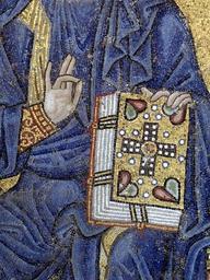 Keywords: image mosaic historically antique christianity faith church christ jesus cross golden byzantine hand finger bible book
