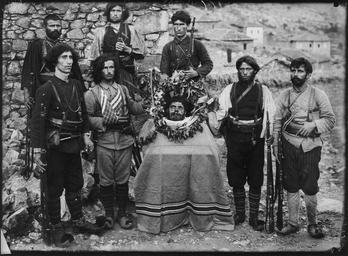 Keywords: IMARO-band-Dambeni-Atanas-Karshakov-head.jpg Четата на Атанас Къ шаков в село Дъмбени днес Денд охо и Гъ ция с от язаната глава на войводата От ляво надясно Тъ по Гео гиев от Чети ок Липо Са ов Къ шаков Пандо от Чети ок Косту ско и влах от четата на Александъ Кошка а вто ия ед влах от четата на Кошка До о от Д еничево и четник от Доб олища IMARO band of Atanas Karshakov in the village of Dambeni today Dendrohori Greece with the severed head of Karshakov Λεωνίδας Πα άζογλου Φωτογραφικά ορτραίτα α ό την Καστοριά και την εριοχή της την ερίοδο του ακεδονικού Αγώνα ουσείο Φωτογραφίας Θεσσαλονίκης 2004 1907-07-04 Leonidas Papazoglou 1872 - 1918 PD-art Atanas Karshakov Pictures by Leonidas Papazoglou IMARO Historical images of the Kastoria Prefecture Beheadings 1907 photographs 4 July Tarpo Georgiev