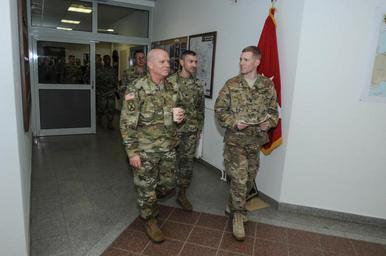 | Keywords: 4id mce baumholder rheinland-pfalz rheinlandpfalz germany de Lt. Gen. Kenneth R. Dahl (left), the commanding general of U.S. Army Installation Management Command, talks with 4th Infantry Division, Mission Command Element battle captain, 1st Lt. Robert Hall, before going into the Joint Operation Center in the 4th Infantry Division MCE headquarters at Baumholder, Germany, Jan. 13, 2016. Dahl took a tour of the facilities and was given an operational brief about the unit’s mission in support of Atlantic Resolve. (Photo by Sgt. 1st Class Jason Epperson, MCE PAO, VIRIN: 160113-A-RK974-512) Lt. Gen. Kenneth R. Dahl (left), the commanding general of U.S. Army Installation Management Command, talks with 4th Infantry Division, Mission Command Element battle captain, 1st Lt. Robert Hall, before going into the Joint Operation Center in the 4th Infantry Division MCE headquarters at Baumholder, Germany, Jan. 13, 2016. Dahl took a tour of the facilities and was given an operational brief about the unit’s mission in support of Atlantic Resolve. (Photo by Sgt. 1st Class Jason Epperson, MCE PAO, VIRIN: 160113-A-RK974-512) |