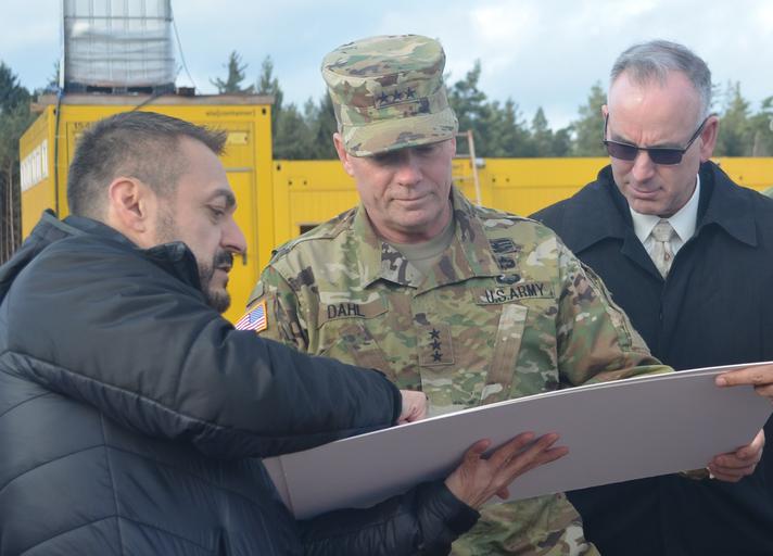 | Keywords: outdoor Lt. Gen. Kenneth R. Dahl, IMCOM commander, learns about the Rhein Ordnance Barracks Medical Center replacement project during a Jan. 13 visit to U.S. Army Garrison Rheinland-Pfalz. This was Dahl’s first visit to U.S. Army Garrison Rheinland-Pfalz as IMCOM commander. Other stops on his visit to the garrison included the 4th Infantry Division Mission Command Element on Smith Barracks, the European Activity Set operations at Coleman Worksite, and The Exchange’s future logistics hub at Germersheim Army Depot. Dahl took command of IMCOM, from Lt. Gen. David D. Halverson Nov. 3. (Photo by Stefan Alford, USAG Rheinland-Pfalz PAO) Lt. Gen. Kenneth R. Dahl, IMCOM commander, learns about the Rhein Ordnance Barracks Medical Center replacement project during a Jan. 13 visit to U.S. Army Garrison Rheinland-Pfalz. This was Dahl’s first visit to U.S. Army Garrison Rheinland-Pfalz as IMCOM commander. Other stops on his visit to the garrison included the 4th Infantry Division Mission Command Element on Smith Barracks, the European Activity Set operations at Coleman Worksite, and The Exchange’s future logistics hub at Germersheim Army Depot. Dahl took command of IMCOM, from Lt. Gen. David D. Halverson Nov. 3. (Photo by Stefan Alford, USAG Rheinland-Pfalz PAO) |