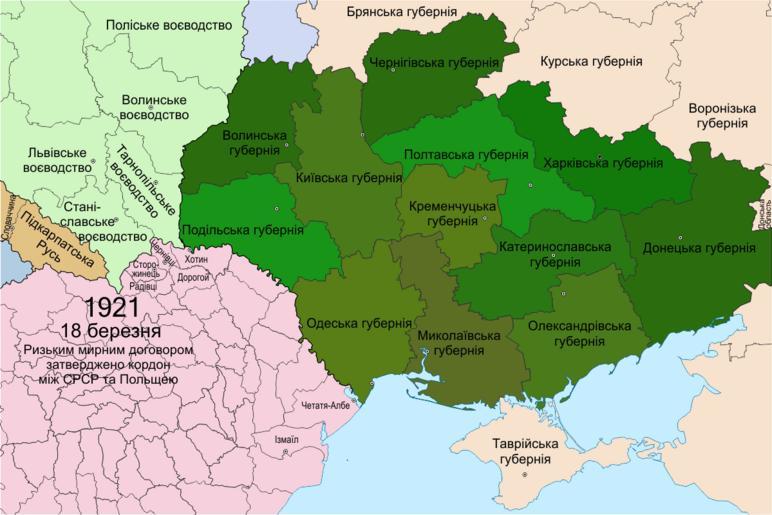 | Keywords: Зміни адміністративного поділу сучасної території України 1921–1994.gif uk на мапі показані межі одиниць адмініст ативного поділу пе шого івня к аїн що містили на вказаний момент те ито ії нинішньої Ук аїни адмініст ативні цент и пе шого івня озташовані на те ито ії нинішньої Ук аїни 1921 18 бе езня Ризьким ми ним догово ом затве джено ко дон між СРСР та Польщею 1921 23 бе езня Олександ івська губе нія пе ейменована азом з її цент ом 1921 27 квітня Пе еяславський повіт Полтавської губе нії віднесено до Київської губе нії 1921 18 жовтня ство ена К имська АРСР 1922 21 жовтня ліквідовані иколаївська Запо ізька та К еменчуцька губе нії 1923 12 квітня із введенням поділу на ок уги змінено межі губе ній межі можуть бути уточнені 1924 3 бе езня озши ення БСРР 1924 12 жовтня ство ено Автономну олдавську СРР 28 жовтня алинську ок угу на Київщині озфо мувано 26 листопада скасування Балтської ок уги Одеської губе нії 1924 10 г удня колишня Аджамська волость пе ечислена зі складу Кате инославщини до Одещини 1925 5 січня уточнено межі Ха ківської та Полтавської губе ній 1925 31 бе езня 3 сіль ади К асног адської ок уги пе едано до Ха ківської 1925 че вень ско очення кількості та зміна меж ок уг 1 се пня скасовано поділ на губе нії 43 ок уги безпосе едньо підпо ядковані цент ові 1925 19 се пня овго од-Сіве ська ок уга ефо мована 1925 15 ве есня Житоми ська ок уга пе ейменована 1925 16 жовтня зміна ко дону між УСРР та РСФРР 1926 17 лютого зміна межі між Павлог адською та Кате инославською ок угами 1926 16 че вня Павлог адська ок уга ліквідована 20 липня Кате инославська ок уга та її цент пе ейменовані 6 г удня 1926 озши ена БСРР 1927 січень Че каська ок уга пе ейменована 14 т авня 1928 зап оваджено Цент ально-Чо ноземну область 1928 цент олдавської АРСР пе енесено до с Бі зула 19/24 жовтня уточнення ко дону між УСРР та РРФСР 1929 цент олдавської АРСР пе енесено до м Ти асполь 1930 13 че вня скасовано 13 ок уг 1930 15 ве есня поділ на ок уги скасовано 1930 16 г удня Са ненський повіт пе едано до Волинського воєводства 1931 17 квітня Ту чанський повіт пе едано до Львівського воєводства 1932 9/27 лютого утво ення 5 областей; 13 айонів та 4 міста Донеччини підпо ядковані безпосе едньо цент у 4 квітня 6 айонів 22 че вня 2 айони пе етво ені на міські ади межі умовно 1932 2 липня ство ена Донецька область 1932 16 липня цент Донецької области пе енесено до м Сталіне 1932 15 жовтня ство ена Че нігівська область 2 айони Київської області пе едано до Ха ківської 7 айонів Вінницької пе едано до Київської 1934 5 бе езня декілька сіль ад Яготинського айону Ха ківської області пе едано до складу ало-Дівицького айону Че нігівської області 1934 4 че вня село Олено-Ко ицьке Одеської області пе едано до складу А СРР 13 че вня 1934 Цент ально-Чо ноземна область поділена 1934 24 че вня столиця УРСР пе енесена до Києва 1935 14 листопада із Близнецівського айону Ха ківської області до Дніп опет овської були за аховані 4 сіль ади 1937 22 ве есня ство ено 4 нових області 1938 3 че вня Донецька область озділена на дві 1938 14 се пня Румунія поділена на цинути 1938 26 жовтня Підка патська Русь пе ейменована 1938 2 листопада за Пе шим Віденським а біт ажем Уго щині пе едано південь Ка патської Русі та південь Словаччини п иєднані 12 листопада 10 листопада цент Ка патської Ук аїни пе енесено до м Хуст 1939 10 січня ство ені Запо ізька Кі овог адська та Сумська області 1939 14 бе езня утво ена Словацька еспубліка 1939 15 бе езня Уго щина захопи