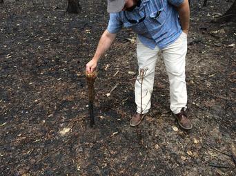 Keywords: outdoor A longleaf pine sapling that survived a recent burn next to a loblolly pine sapling that did not. A longleaf pine sapling that survived a recent burn next to a loblolly pine sapling that did not.