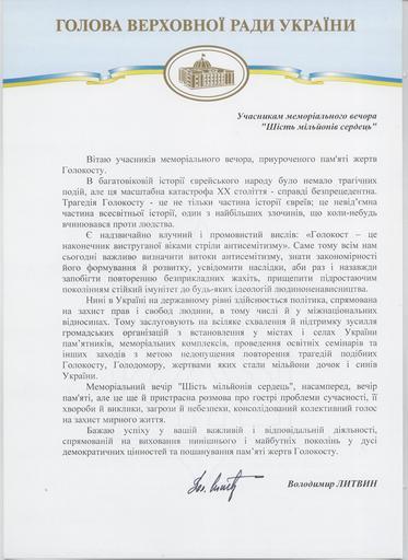 Keywords: Заявление о памяти Холокоста от Владимира Литвина главы Верховной Рады Украины.jpg ru Заявление о памяти Холокоста от Владими а Литвина главы Ве ховной Рады Ук аины Ukrainian Goverment Vladimir Letvin PD-Ukraine The Holocaust in Ukraine Volodymyr Lytvyn |
