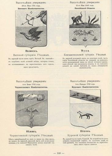 | Keywords: Нолинск Нуха Нежин Обоянь из Винклера.jpg Official Russian Empire coats of arms Ге бы го одов Российской Импе ии олинск уха ежин Обоянь с официальными описаниями в Ге бовнике Винкле а П П фон-Винкле Ге бы го одов губе ний областей и посадов Российской Импе ии внесенные в Полное Соб ание законов с 1649 по 1900 год Дозволено цензу ою С -Пете бу г 20 Июля 1899 года Издание книгото говца Ив Ив Иванова С -Пете бу г Типог афия И Комелова П яжка д 3 1899 \ Scanned by Vizu 1899 published П П фон Винкле \ Pavel von Vinkler PD-old PD-RusEmpire PD-RU-exempt coats of arms Gerbovnik Vinklera - Pages 108 Coats of arms of Kursk Governorate |