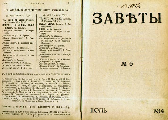 | Keywords: Заветы.jpg Жу нал Заветы титульный лист собственное скани ованное изоб ажение Originally uploaded on ru wikipedia июнь 2009 г Uploaded on Commons at 2012-02-12 17 34 08 UTC /Originally uploaded at 2009-06-07 06 58 30 triumphato Transferred by Triumphato/Originally uploaded by Triumphato Original upload log page ru wikipedia D0 97 D0 B0 D0 B2 D0 B5 D1 82 D1 8B jpg Upload date User Bytes Dimensions Comment 2009-06-07 06 58 30 Triumphato 1461678 1150827 <small><nowiki> Описание Жу нал Заветы титульный лист Источник собственное скани ованное изоб ажение В емя создания июнь 2009 </nowiki></small> Magazines of Russia 1914 Cover of book scanned by Triumphato Magazines of Russia to be categorised by name |