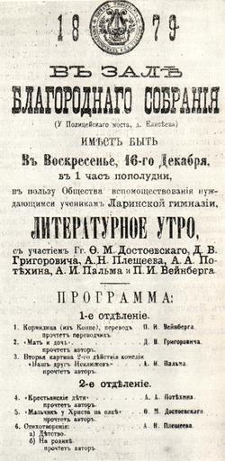 | Keywords: Программа литературного утра.jpg ru П ог амма лите ату ного ут а в пользу нуждающихся учеников 1879 Лите ату ное наследство Т 86 аука 1973 ст 463 Ф Достоевский Д В Г иго ович А Плещеев А А Потехин А И Пальм П И Вейнбе г PD-RusEmpire Uploaded with UploadWizard Fyodor Dostoyevsky Images scanned by Triumphato |