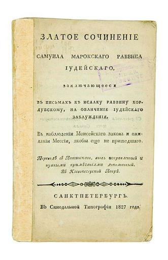 | View Original: | Самуил Марокский. Златое сочинение, заключающееся в письмах к Исааку раввину Кордубскому. (1827) — Титульный лист.jpg (453x700) | |||