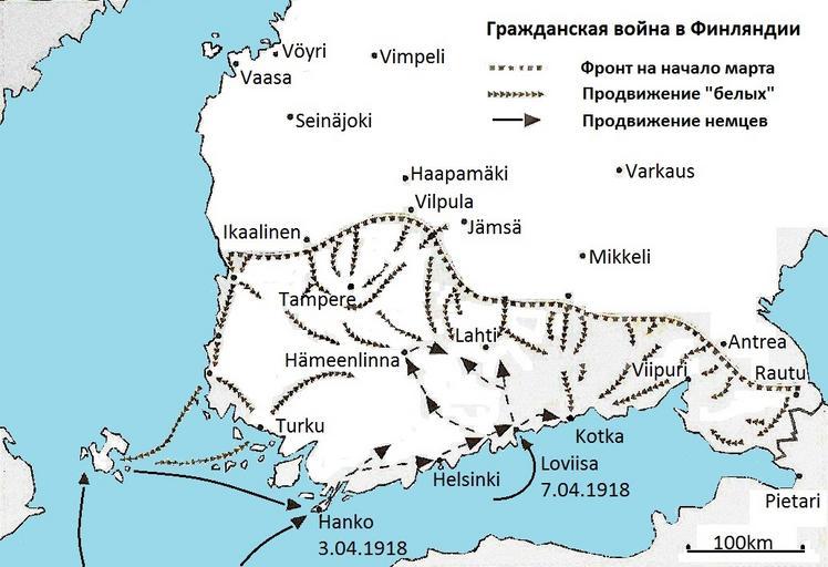 | Keywords: Гражданская война в Финляндии.jpg military map ru П одвижение войск во в емя г ажданской войны в Финляндии fi Valkoisten ja saksalaisten eteneminen sisälissodan aikana Own kovako-1 2010-03-10 cc-zero Maps of Civil war of Finland Maps in Russian Maps of battles of Finland |