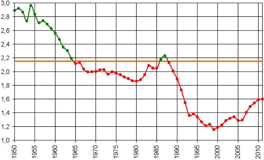| Keywords: Изменение суммарного коэффициента рождаемости в России (1950 - 2011).PNG  ru Изменение сумма ного коэффициента  ождаемости в России с 1950 по 2011 года 2012-04-11 own на основе http //demoscope ru/weekly/app/gtfr php c25 1 Submit CF EE F1 F2 F0 EE E8 F2 FC+ E3 F0 E0 F4 E8 EA Ювеналюс Data wikitable style text-align right; Russia - 1950 2 889000 - 1951 2 921000 - 1952 2 867000 - 1953 2 737000 - 1954 2 964000 - 1955 2 834000 - 1956 2 712000 - 1957 2 741000 - 1958 2 690000 - 1959 2 630000 - 1960 2 560507 - 1961 2 468587 - 1962 2 357268 - 1963 2 307919 - 1964 2 189276 - 1965 2 118554 - 1966 2 130719 - 1967 2 036557 - 1968 1 994359 - 1969 1 999041 - 1970 2 000587 - 1971 2 025496 - 1972 2 028281 - 1973 1 963183 - 1974 1 996756 - 1975 1 973974 - 1976 1 956575 - 1977 1 920421 - 1978 1 899641 - 1979 1 865047 - 1980 1 862318 - 1981 1 881078 - 1982 1 955467 - 1983 2 087095 - 1984 2 050508 - 1985 2 050576 - 1986 2 177135 - 1987 2 229789 - 1988 2 130000 - 1989 2 007000 - 1990 1 892000 - 1991 1 732000 - 1992 1 547000 - 1993 1 360000 - 1994 1 385000 - 1995 1 337000 - 1996 1 270000 - 1997 1 212000 - 1998 1 232000 - 1999 1 157000 - 2000 1 190000 - 2001 1 223000 - 2002 1 286000 - 2003 1 319000 - 2004 1 340000 - 2005 1 287000 - 2006 1 296000 - 2007 1 406000 - 2008 1 490000 - 2009 1 540000 - 2010 1 590000 - 2011 1 600000 cc-zero Uploaded with UploadWizard Demographics of Russia |