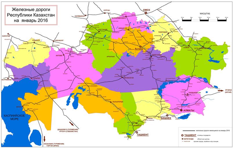 Keywords: Железные дороги Казахстана.jpg map ru Железные до оги Казахстана по состоянию на янва ь 2016 года Отче чено в AutoCAD 2014-12-24 own Kalabaha1969 other versions cc-zero Maps of Kazakhstan Rail transport in Kazakhstan