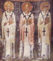 | Keywords: Свтт. Лев, Григорий, Сильвестр Римские.jpg ru Свтт Лев Г иго ий Сильвест Римские Ф еска Х ам Святой Софии Ох ид акедония 1037 - 1056 годы http //www patriarchia ru/data/365/843/1234/1IMG_01 jpg author century 11 PD-Macedonia Sylvester I Paintings in St Sophia Church Ohrid |