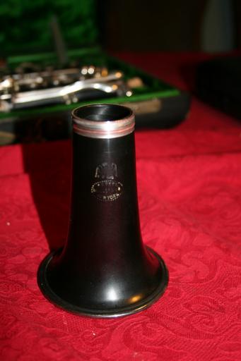 Keywords: penzal müller mueller clarinet a wood vintage indoor The bell with the emblem stamped into it. I am not sure if this is the original bell or not. It is made of bakelite, not wood. Perhaps this means this is in fact a student horn? Which might explain why it doesn't have a model name. I am unsure if they made plain student horns along with the horns with model names. The bell with the emblem stamped into it. I am not sure if this is the original bell or not. It is made of bakelite, not wood. Perhaps this means this is in fact a student horn? Which might explain why it doesn't have a model name. I am unsure if they made plain student horns along with the horns with model names.