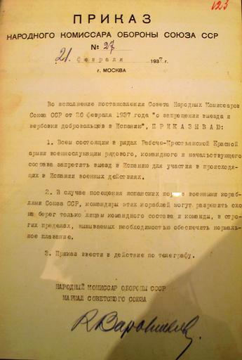 | Keywords: Приказ наркома обороны СССР О запрещении выезда и вербовки добровольцев в Испанию. 1937.jpg de Verordnung des sowjetischen Volkskommissars Woroschilow über des Verbot der Ausreise von Sowjetbürgern nach Spanien und der Werbung Freiwilliger für den Kampf in Spanien ru П иказ на одного комисса а обо оны Союза ССР 27 О зап ещении выезда и ве бовки доб овольцев в Испанию 21 фев аля 1937 г original upload on Russian wikipedia http //ru wikipedia org/wiki/ D0 98 D0 B7 D0 BE D0 B1 D1 80 D0 B0 D0 B6 D0 B5 D0 BD D0 B8 D0 B5 D0 9F D1 80 D0 B8 D0 BA D0 B0 D0 B7_ D0 BD D0 B0 D1 80 D0 BA D0 BE D0 BC D0 B0_ D0 BE D0 B1 D0 BE D1 80 D0 BE D0 BD D1 8B_ D0 A1 D0 A1 D0 A1 D0 A0_ D0 9E_ D0 B7 D0 B0 D0 BF D1 80 D0 B5 D1 89 D0 B5 D0 BD D0 B8 D0 B8_ D0 B2 D1 8B D0 B5 D0 B7 D0 B4 D0 B0_ D0 B8_ D0 B2 D0 B5 D1 80 D0 B1 D0 BE D0 B2 D0 BA D0 B8_ D0 B4 D0 BE D0 B1 D1 80 D0 BE D0 B2 D0 BE D0 BB D1 8C D1 86 D0 B5 D0 B2_ D0 B2_ D0 98 D1 81 D0 BF D0 B0 D0 BD D0 B8 D1 8E _1937 jpg <br>Russisches Staatsarchiv Госа хив РФ - http //rusarchives ru/evants/exhibitions/civil-war-spain-kat/98 shtml Kliment Woroschilow 1937-02-21 PD-old PD-RU-exempt signatures Kliment Voroshilov Signatures of generals from Russia Spanish Civil War |