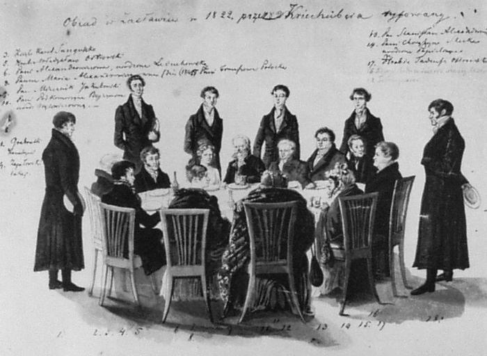 | Keywords: Юзеф Крієгубер. Обід у Заславі в 1822 році.png  uk Папі аква ель 3 Князь Ка л Санґушко 5 Г аф Владислав Ост овський 6 Пані Александ овичева в оджена Ледухівська 8 Панна  а ія Александ івна /на/1845/ Пані Томашова Потоцька 9 Пан  ечник Якубовський 10 Пані підкомо на Бейзимова в оджена Вансовичівна 13 Пан Станіслав Александ ович 14 Пані Хо унжівна Стецька / в оджена Попелівна 17 Г аф Тадеуш Ост овський 18 Ґодф ид Радзимінський хо унжий заславський 19 Толочинський Се ед п ислуги яка стоїть за к іслами това иства 1 Г абовський /каме дине / 2 Запаловський /льокай/ Obiad w Zasławiu а хів Creator Joseph Kriehuber 1822 PD-old-100 Josef Kriehuber Sanguszko family Sanguszko Palace Iziaslav People of Izyaslav Unidentified people in Khmelnytsky Oblast History of Zaslav 19th-century people of Poland |