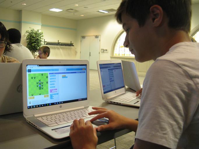 Keywords: kalamazoo kalamazoo public library kalamazoopubliclibrary code indoor KPL Code Camp: Teens work together to solve problems while learning basic computer programming skills, www.kpl.gov KPL Code Camp: Teens work together to solve problems while learning basic computer programming skills, www.kpl.gov