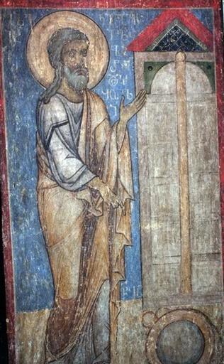 Keywords: იეზეკიელი.jpg The mural in Betania Monastery Georgia The mural is called იეზეკიელი The official disk of Betania monastery XII-XIII centuries Created by order of Queen Tamar of Georgia PD-Art Betania southern wall murals Asomtavruli frescos