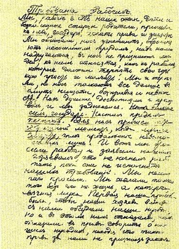 Keywords: Рабочая петиция.jpg ru Один из укописных списков Рабочей петиции 9 янва я 1905 года http //chron eduhmao ru/page_1_9_0 html author 1905 год PD-old Bloody Sunday 1905
