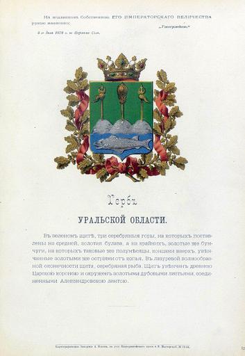 | Keywords: Уральская область из Бенке.jpg Official Russian Empire coat of arms Ural Oblast Ге б Российской Импе ии У альской области с официальным описанием в Ге бовнике Бенке Утве ждён Импе ато ом Все оссийским Александ ом Вто ым в 1878 году Ге бы губе ний и областей Российской Импе ии Отпечатано по аспо яжению минист а внут енних дел Санкт-Пете бу г Ка тог афическое заведение А А Ильина и типог афия инисте ства путей сообщения А Бенке 1880 / Scanned on paper album 1878 / 1880 published Russian Empire PD-old PD-RusEmpire PD-RU-exempt <gallery> File У альская область ВД Бенке jpg File У альская область изд Сукачова JPG File У альская обл 1878 из Винкле а jpg File Ströhl-HA-LI-Fig 12 png File Coat of Arms of Uralsk Province png </gallery> <references/> Ural Oblast Fish in heraldry Gerbovnik Benke |