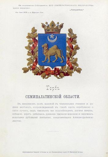 | Keywords: Семипалатинская область из Бенке.jpg Official Russian Empire coat of arms Semipalatinsk Oblast Ге б Российской Импе ии Семипалатинской области с официальным описанием в Ге бовнике Бенке Утве ждён Импе ато ом Все оссийским Александ ом Вто ым в 1878 году Ге бы губе ний и областей Российской Импе ии Отпечатано по аспо яжению минист а внут енних дел Санкт-Пете бу г Ка тог афическое заведение А А Ильина и типог афия инисте ства путей сообщения А Бенке 1880 / Scanned on paper album 1878 / 1880 published Russian Empire PD-old PD-RusEmpire PD-RU-exempt <gallery> File Семипалатинская область изд Сукачова JPG File Семипалатинская обл 1878 из Винкле а jpg File Coat of Arms of Semipalatinsk Province png File Семипалатинск из Винкле а jpg </gallery> Semipalatinsk Oblast Camels in heraldry 1 crescent argent in heraldry 1 five rays argent in heraldry Gerbovnik Benke |