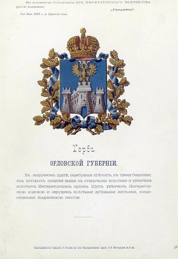 Keywords: Орловская губерния из Бенке.jpg Official Russian Empire coat of arms Orel Governorate Гласный ге б Российской Импе ии О ловской губе нии с официальным описанием в Ге бовнике Бенке Утве ждён Импе ато ом Все оссийским Александ ом Вто ым в 1878 году Ге бы губе ний и областей Российской Импе ии Отпечатано по аспо яжению минист а внут енних дел Санкт-Пете бу г Ка тог афическое заведение А А Ильина и типог афия инисте ства путей сообщения А Бенке 1880 / Scanned on paper album 1878 / 1880 published Russian Empire PD-old PD-RusEmpire PD-RU-exempt coats of arms <gallery> File О ловская губ ВД Бенке jpg File О ловская губе ния изд Сукачова jpg File Coat of Arms of Oryol gubernia Russian empire png </gallery> <references/> Coats of arms of Orel Governorate Eagles in heraldry Castles in heraldry Russian canting arms Gerbovnik Benke