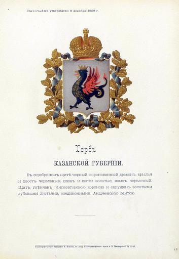 Keywords: Казанская губерния из Бенке.jpg Official Russian Empire coat of arms Kazan Governorate Ге б Российской Импе ии Казанской губе нии с официальным описанием в Ге бовнике Бенке Утве ждён Импе ато ом Все оссийским Александ ом Вто ым Ге бы губе ний и областей Российской Импе ии Отпечатано по аспо яжению минист а внут енних дел Санкт-Пете бу г Ка тог афическое заведение А А Ильина и типог афия инисте ства путей сообщения А Бенке 1880 / Scanned on paper album 1856 / 1880 published Russian Empire PD-old-100 PD-RusEmpire PD-RU-exempt coats of arms <gallery> File Казанская губ ВД Бенке jpg File Казанская губе ния изд Сукачова JPG File Coat of Arms of Kazan gubernia Russian empire png </gallery> Coats of arms of Kazan Governorate Gerbovnik Benke Zilants in heraldry